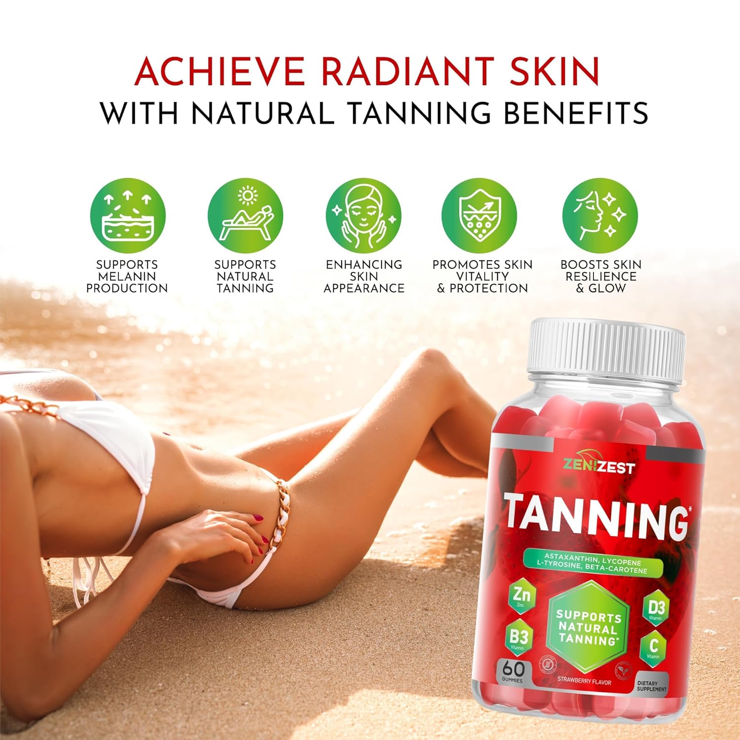 Supports Natural Tanning from Within: ZeniZest Tanning Gummies combine Astaxanthin, Lycopene, Beta-Carotene, and L-Tyrosine to help support the body’s natural melanin production. These ingredients work in harmony to enhance the appearance of a gradual, sun-kissed self tan while promoting a more even-looking skin tone. Designed to complement natural tanning processes, it offers a glow-supportive approach to promote a radiant look, with or without sun exposure.