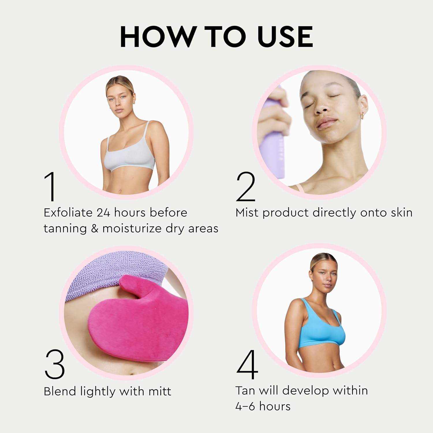 Sunless tanning mist develops in just 4 hours and dries quickly to a touch-dry finish- just spray directly onto skin and blend with a tanning mitt for an even, bronzed glow